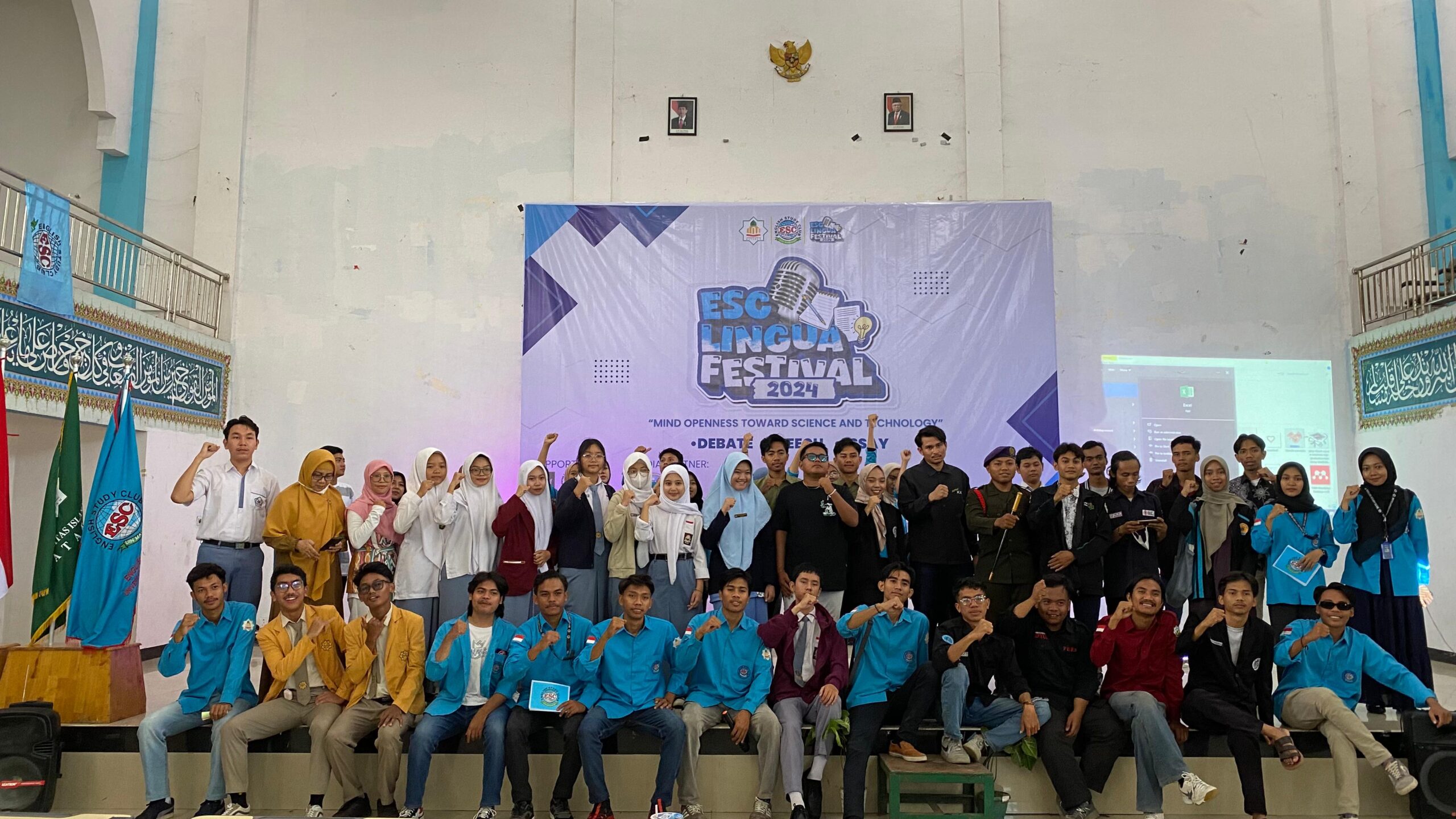 Foto Bersama Anggota ESC UIN Mataram dan Peserta ESC Lingua Festival 2024 yang Berlangsung di Gedung Auditorium Kampus I UIN Mataram pada Senin (09/09/2024)