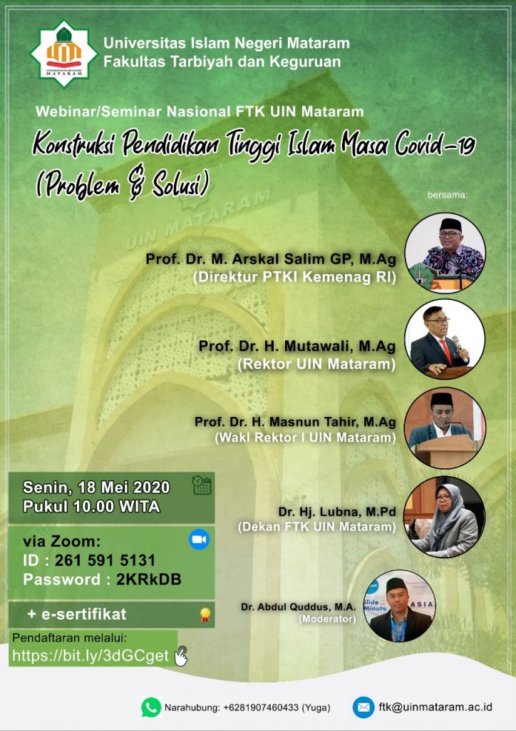 UIN Mataram — Setelah Lembaga Penelitian dan Pengabdian pada Masyarakat (LP2M) sukses dengan Tadarus LP2M UIN Mataram yang mengangkat tema: Puasa dan Covid-19: Dialektika Maqashid Syariah & Dinamika Sosial Masyarakat. Kini giliran Fakultas Tarbiyah dan Keguruan mengadakan seminar berbasis daring. Tidak tanggung-tanggung Direktur Perguruan Tinggi Keagamaan Islam (PTKI) Kementrian Agama, Prof. Dr. M. Askar Salim GP, M.Ag., akan turut menumpahkan pendapatnya pada webinar Senin (18/5) mendatang. Tema yang akan dibahas; Konstruksi Pendidikan Tinggi Islam masa Covid-19 (Problematika & Solusi).