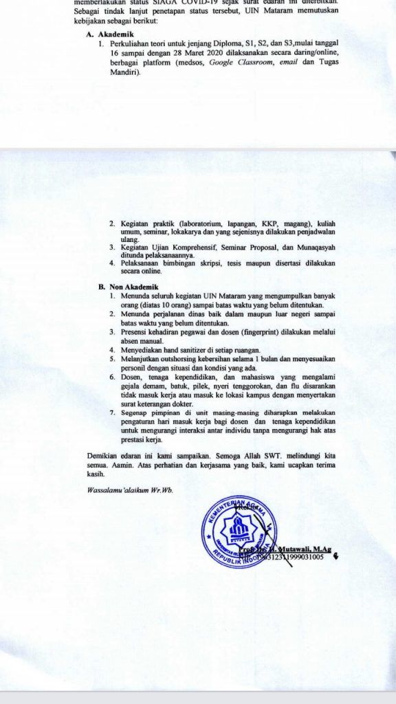 Mataram— Menanggapi surat edaran Gubernur NTB pada Minggu (15/3), UIN Mataram turut siaga Corona. Namun proses perkuliahan tidak diliburkan, hanya metode yang digunakan diubah sampai dua pekan mendatang.