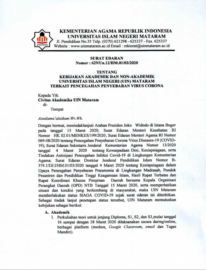 Mataram— Menanggapi surat edaran Gubernur NTB pada Minggu (15/3), UIN Mataram turut siaga Corona. Namun proses perkuliahan tidak diliburkan, hanya metode yang digunakan diubah sampai dua pekan mendatang.