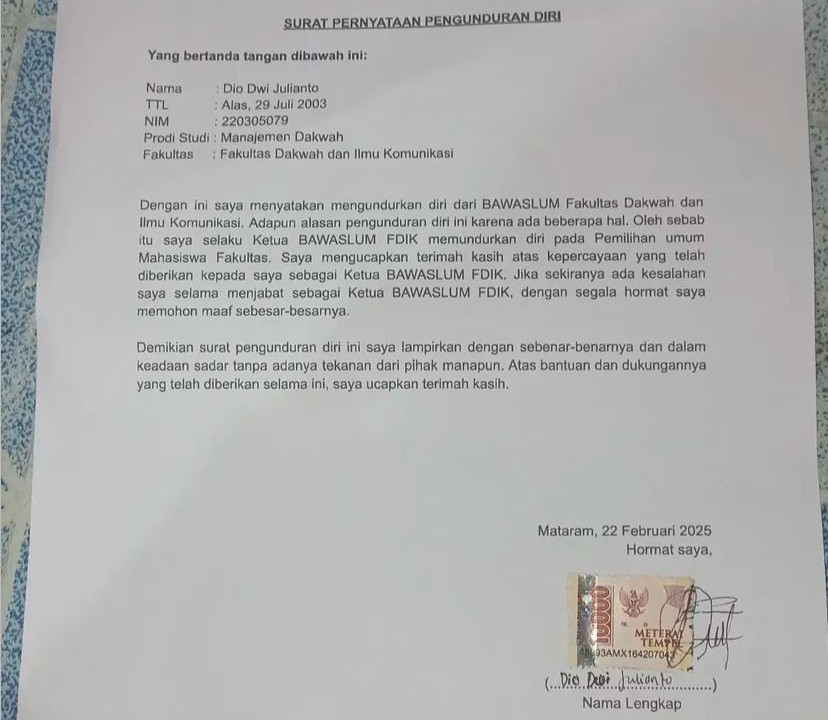 Foto Surat Pengunduran Diri Ketua Bawaslu  Mahasiswa FDIK UIn Mataram