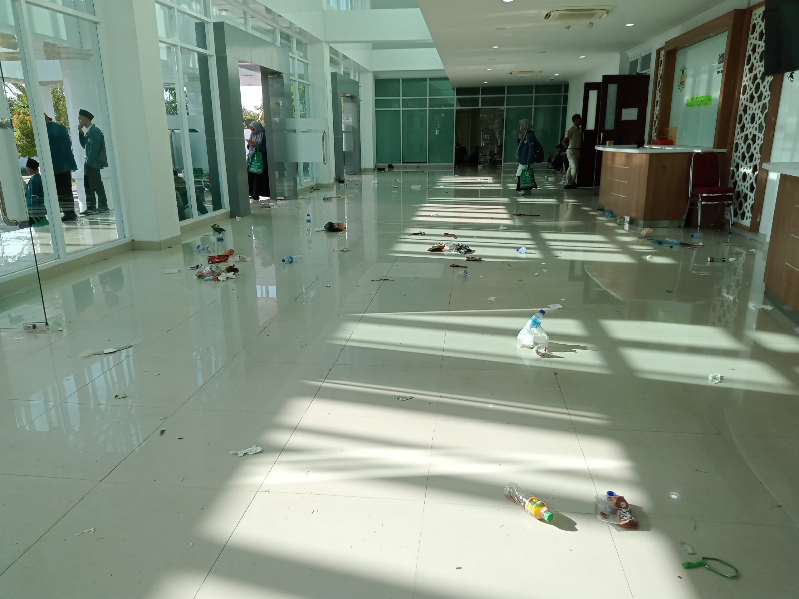 Ro’yuna Redaksi – Pemandangan tak sedap terlihat di dalam gedung Auditorium UIN Mataram, Kampus II. Pasalnya sampah-sampah plastik dan bekas makanan tampak berserakan mengotori seluruh bagian gedung Auditorium usai pelaksanaan kegiatan Pengenalan Budaya Akademik dan Kemahasiswaan (PBAK) pada hari pertama, Senin (07/08/2023).