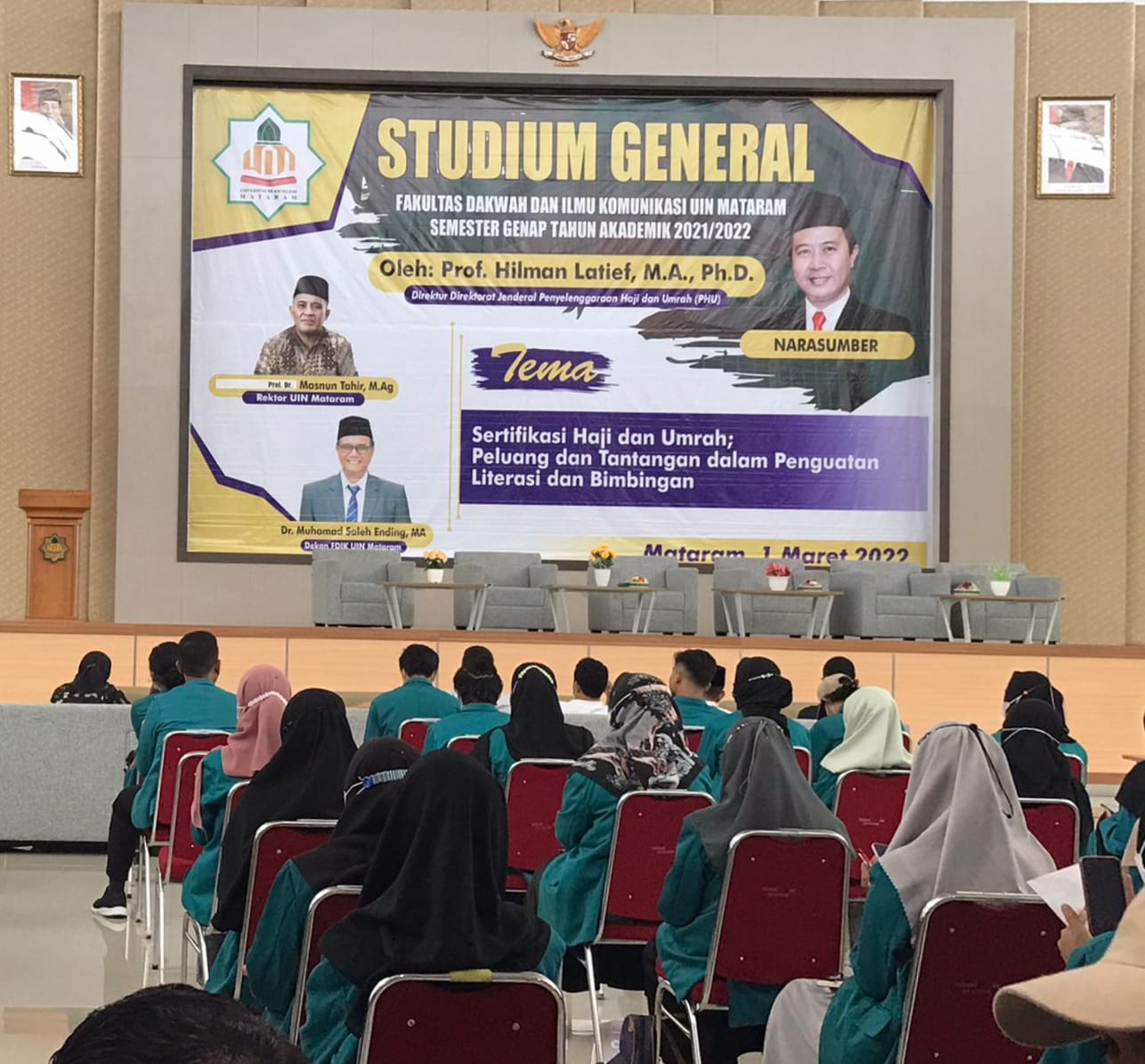 Ro’yuna redaksi- Mengusung tema Sertifikasi Haji dan Umrah Peluang dan Tantangan dalam Penguatan Literasi dan Bimbingan, Fakultas Dakwah dan Ilmu Komunikasi (FDIK) mengadakan Studium General (SG) tahun Akademik 2021/2022 di Auditorium Kampus II UIN Mataram pada Selasa, 1 Maret 2022.