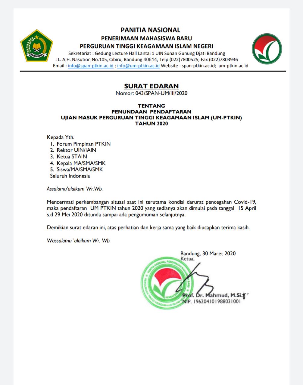 UM-PTKIN yang rencana pendaftarannya dibuka15 April mendatang, ditunda sampai waktu yang belum ditentukan. Kebijakan ini merupakan imbas dari penanganan pandemi covid19.